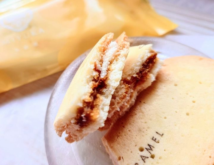 洋風の「生バターとキャラメルのふわシャリサンド」。やわらかいラングドシャにキャラメルクリームと生バターシュガーをサンドしています。こちら、キャラメルが想像以上にほろ苦で大人味!