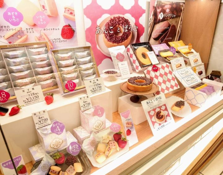 やわらかな光に包まれたショーケースに並ぶ、上品で可愛らしい色合いのお菓子たち。しっとり食感を楽しめる生ラングドシャ、いちごが香るクッキーサンド、リニューアル記念の新商品「あんことばうむ」。美十の長い歴史と経験で培った技術を活かし、こだわりの和洋の素材を組み合わせています。