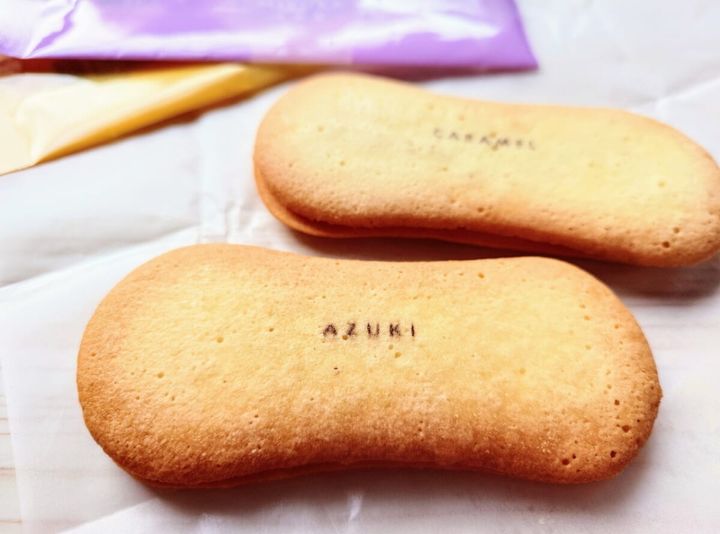 あんバターの定番は外せない「生バターとあずきのふわシャリサンド」。まずはラングドシャをチェック。バターが濃厚で、中央はみっちりしっとり、端っこはよく焼かれて香ばしいです!