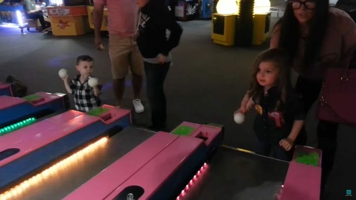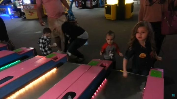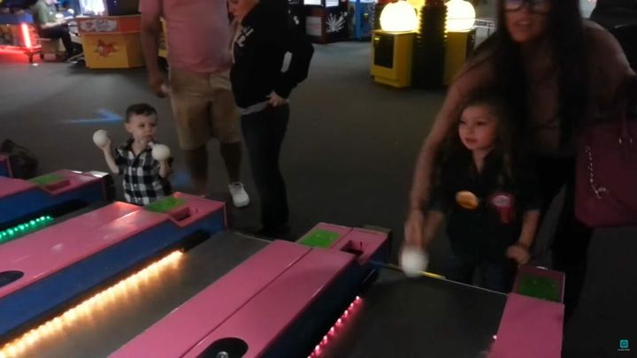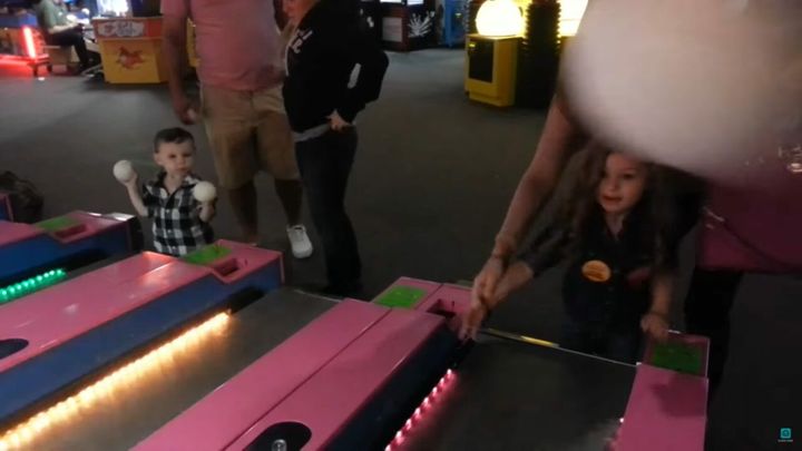 3. スキーボールで遊ぶ女の子。上手くボールを投げられないのでママがアシストに入ったら・・、むしろ大惨事に!!