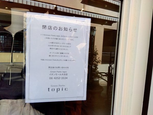 <箕面発>みのおキューズモール内、EAST-3階にあった飲食店とEAST-2階のレディースファッション・雑貨の「Green Parks topic(グリーンパークストピック)」が閉店しました。