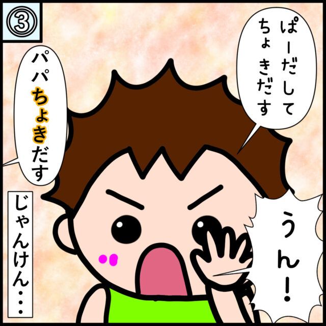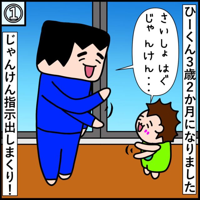 2歳差兄弟みーくんとひーくんのパパであるみーぱぱさんから、じゃんけんのお話です。最近じゃんけんにハマっているというひーくん、パパに勝ちたくて指示を出すのですが・・・。