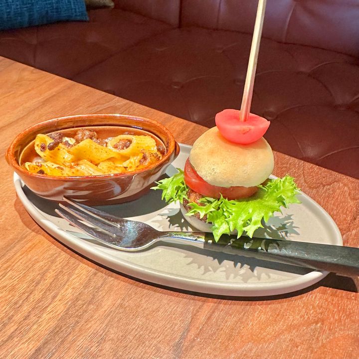 グルテンフリーのミニバンズではさんだハンバーガー。