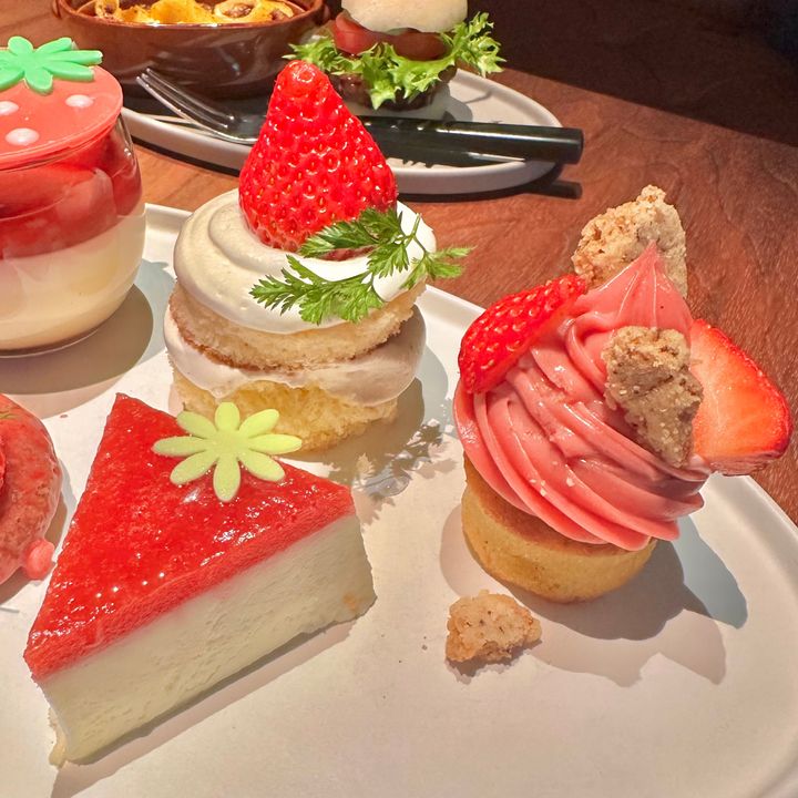 いちごモチーフのスイーツや鮮やかな赤の色合いが可愛らしく、