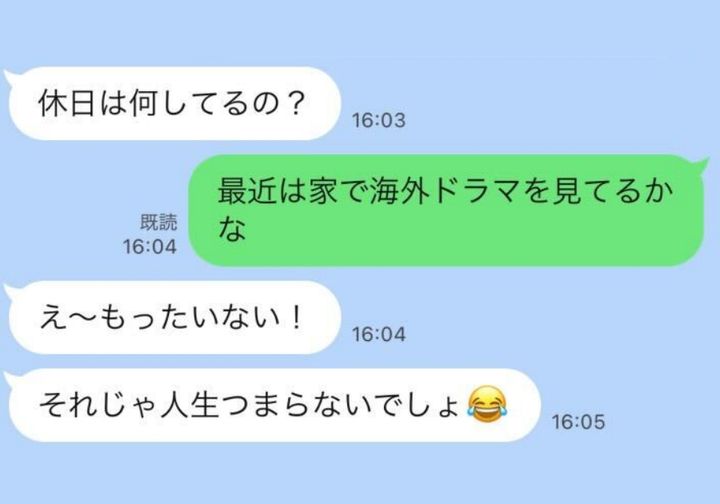 「とある女性から『休日は何してるの?』と聞かれたときのこと。僕は家で海外ドラマを観るのが好きなのでそう伝えたら、『え~もったいない!』『それじゃ人生つまらないでしょ』とダメ出しされてウンザリ。そんなの個人の自由なんだから放っておいてほしいです」(29歳/IT)