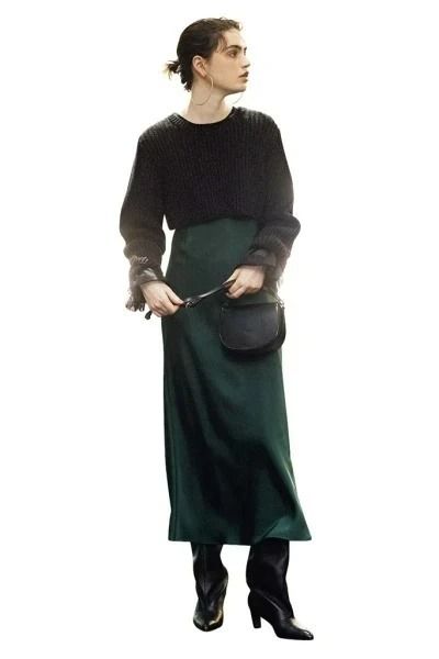 サテン特有の落ち感で細身なAラインを形成。さらにツヤ感をまとえば、例えばフーディやブルゾンなどスポーティなトップスと組み合わせても都会的に。