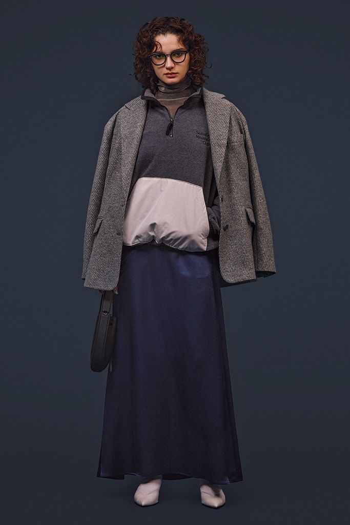 ネイビーサテンスカート 18,900円/ReNAVE(NAVE) グレータートルネックトップス 9,900円/アダム エ ロペ グレーハーフジップトップス 35,200円/SEA(エスストア) ジャケット 49,500円/onit(ヤギ) 眼鏡 55,000円/アヤメ ソックス(2Pセット) 2,420円/THE RALROAD SOCK(メイデン・カンパニー) バッグ 44,000円/VASIC(ヴァジックジャパン) パンプス 35,200円/PIPPICHIC(ベイジュ) 落ち感のあるネイビーで重ね着したトップスさえも軽く見せる。