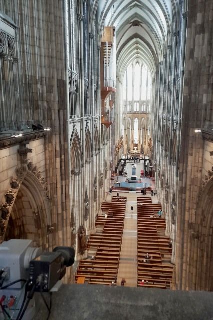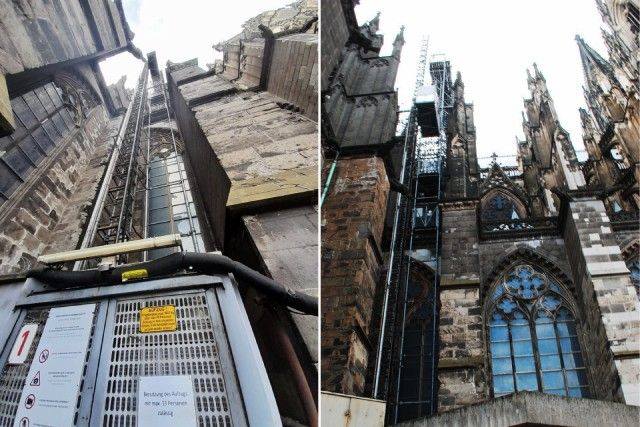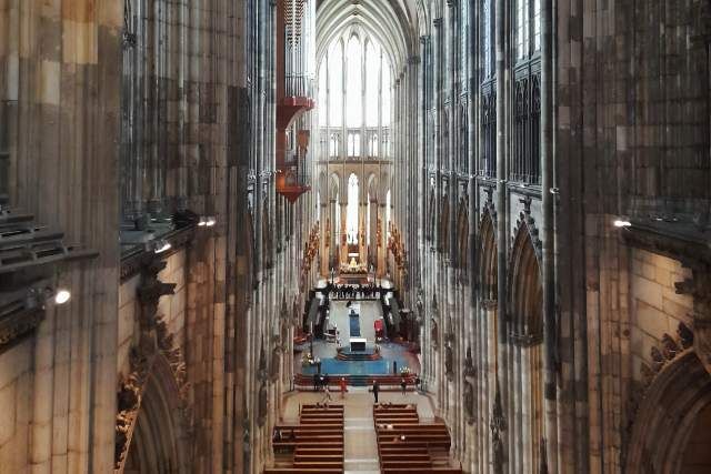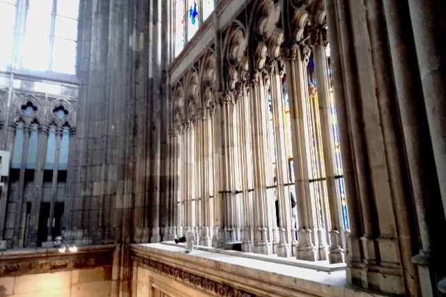 ケルン大聖堂は聖堂内は無料で見学できますが、今回は建物内部を案内してくれるガイドツアーに参加しました。このツアーでは、一般開放されていない展望台まで案内してくれます。近くまでエレベーターが使えるのもうれしいポイント(工事の関係で使えない場合がありますが、その場合は240段の階段を上ります)。