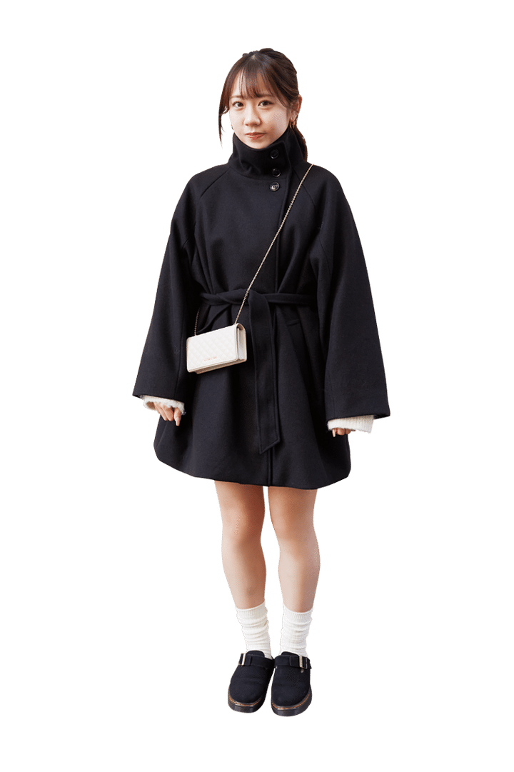 「コートはChicoで13,000円くらいでゲットしました。えりを立ててちょっぴりあざとく着られます♡ そでから中に着た白のふわふわカーデを見せて真っ黒にならないように意識。