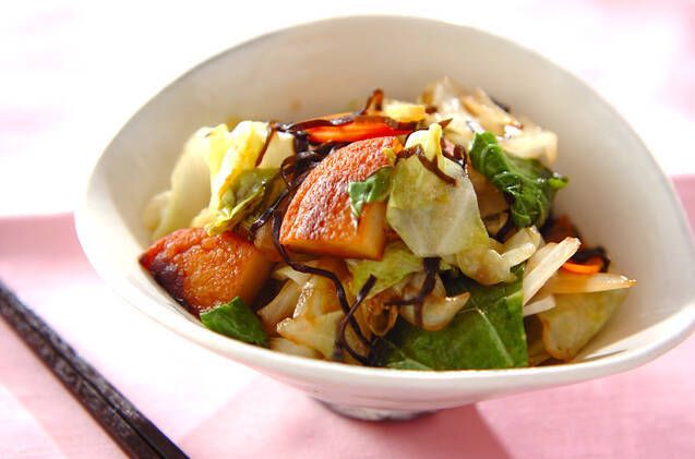 ・【さつま揚げとキャベツなど】調味料2つ!さつま揚げとキャベツの塩昆布炒め