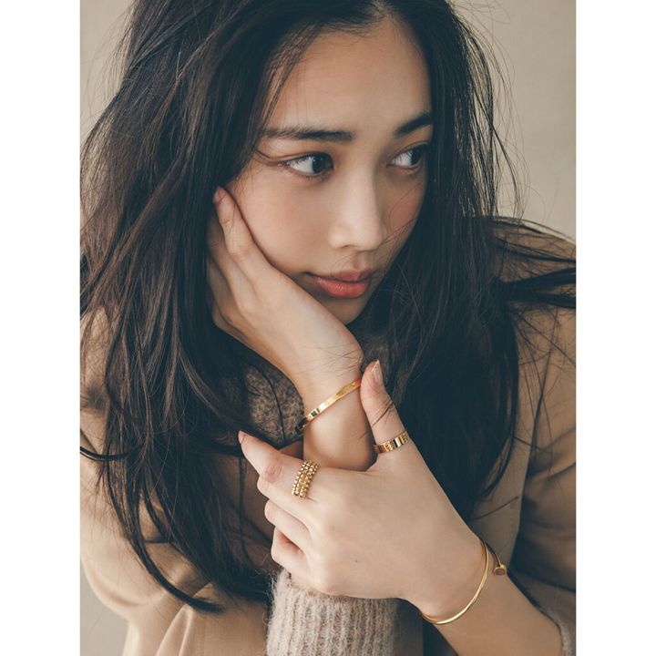 太さに緩急をつけるのがコツ。右手・薬指リング〈YG〉上¥159,500〜下¥192,500〜(ともにジャスティン デイビス/JACK of ALL TRADES press room)右手・人差し指¥39,600左手・人差し指リング¥50,600トリプルフィンガーリング¥63,800(すべてコールムーン/ショールーム セッション)左手・中指上〈YG×D〉¥53,900(アナプノエ/フォーティーン ショールーム)フード付きニット¥53,900(アンタイ トル カプセル コレクション/アンタイトル)タートルニット¥27,500(スローン/ザ ショップ スローン 新静岡セノバ店)