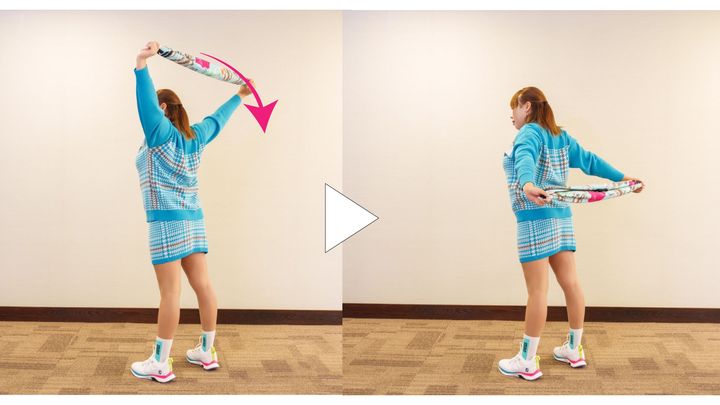両手を伸ばした形からタオルを背中側に下ろしましょう