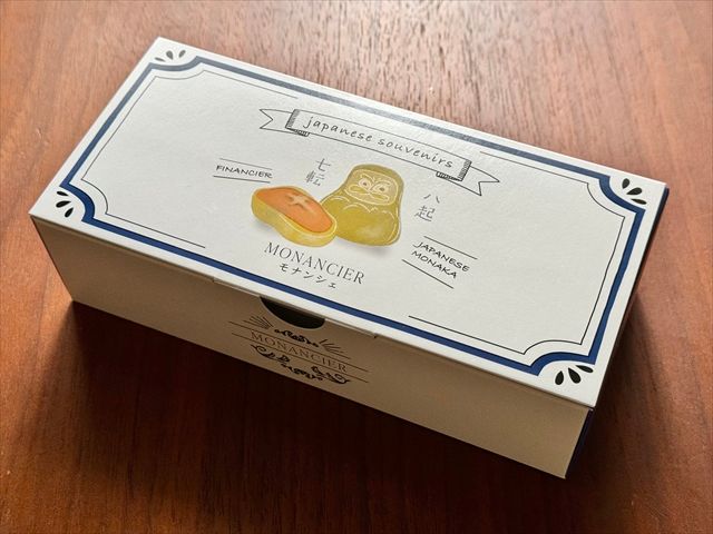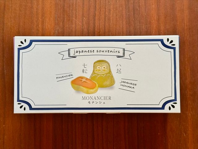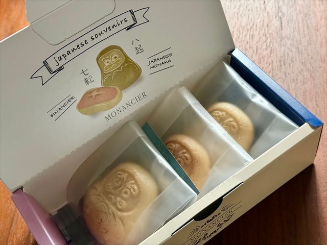 今回は3個入1,080円(税込)のはかたモナンシェを購入しました。6個入1,890円(税込)もあります。箱にもだるまが描かれていて、七転び八起きとのメッセージが。何かに向かって挑戦して頑張っている人にプレゼントしたくなります。そっとこれを差し出すだけで、激励の気持ちが伝わりそう。