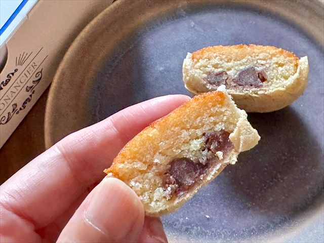 2つにカットしてみると、中には餡が入っていました。しっかり粒感もあるつぶあんです。フィナンシェの中につぶあんが入っているとは、ちょっとしたサプライズ。フィナンシェプラスアルファの甘みを感じる不思議な味わい。そして、小豆も食感のアクセントになりますね。