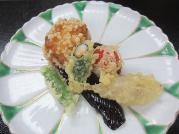 ・揚げ物(海老団子・トマト・青唐・茄子・海老大葉揚げ・花茗荷)