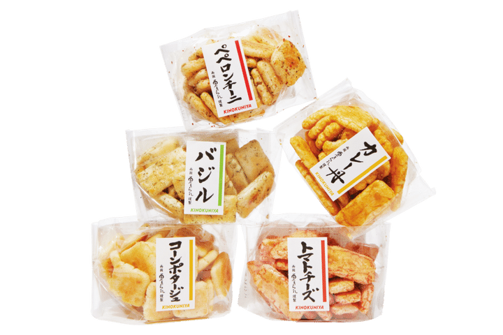 洋風な味付けの本格おかき(ペペロンチーニ・カレー舟・トマトチーズ・コーンポタージュ・バジル)各¥313