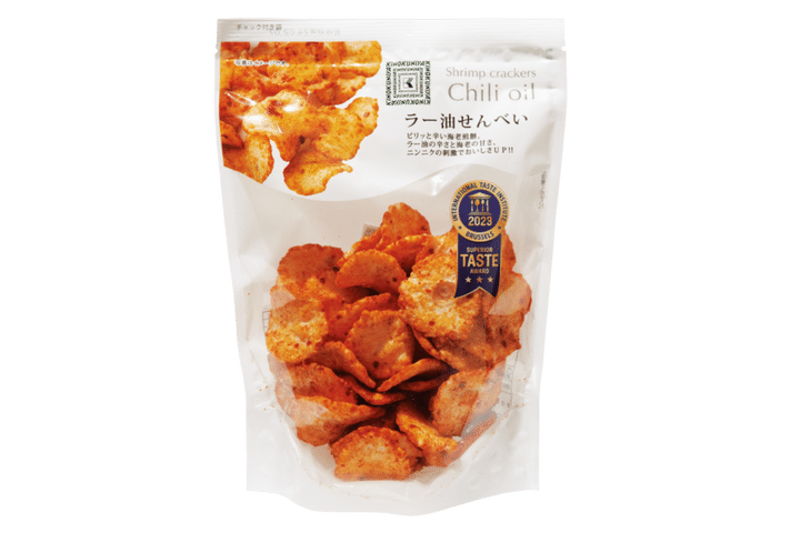 ラー油の辛さとえびの甘さがほどよく融合。ニンニクがピリッと辛い「ラー油せんべい」¥398
