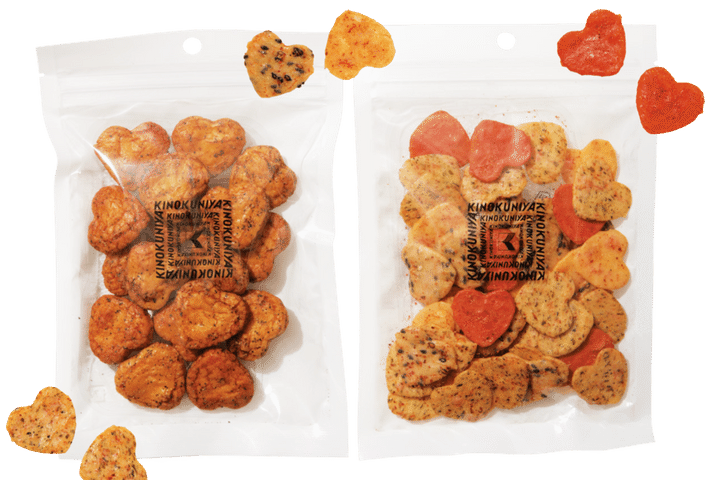 [右]国産うるち米を使用した薄焼き。唐辛子せん¥237、[左]味わうほどに黒胡椒が香るハート形のおせんべい。黒胡椒せん¥237