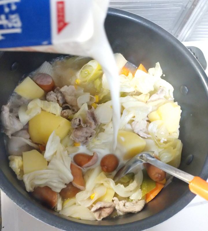 それらを少ない水でコンソメを加えて煮込みます。全ての具材が柔らかくなったら、完成間際で牛乳をドバッと加えてください!分量は適量です。(市販の鍋つゆ程度のイメージで、具材が浸かるくらいがいいかも)