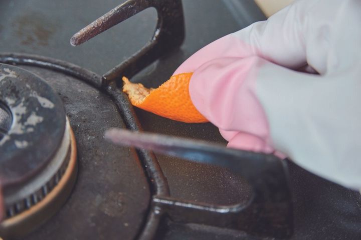 みかんの皮に含まれる精油成分「リモネン」には、油汚れを浮かせて落とす働きがあります。こびりついた汚れや焦げつきには不十分かもしれませんが、乾燥しきっていないベタベタした油汚れなら、みかんの皮でこするだけですっきりピカピカに! もしくは、みかんの皮を煮出した汁をスプレーボトルに入れて油汚れに吹きかけ、その後拭き取るという方法でもOKです。