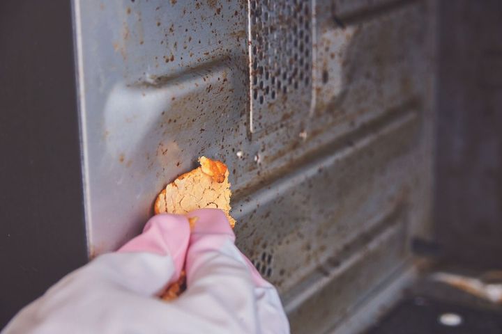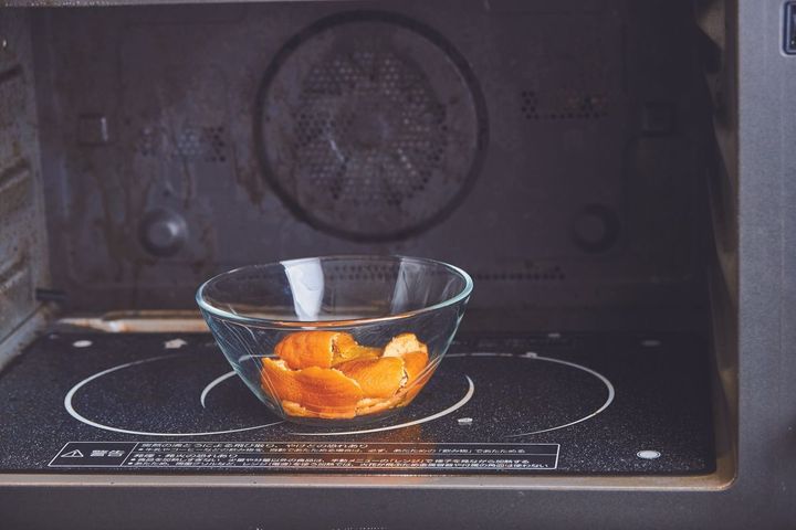 電子レンジ内は、油汚れはもちろん、臭いがつきやすい場所。ただ、食品を直接入れるところだけに、洗剤はあまり使いたくないという人も多いのでは? そんなときもみかんの皮を使った掃除がおすすめ。みかんの皮を電子レンジで加熱すれば、消臭効果があるだけでなく、加熱する際に発生する蒸気で庫内の油汚れが落としやすくなります。