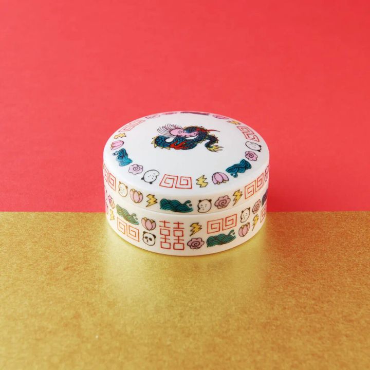 砂糖菓子をいれるための小型容器、ボンボニエール。「もっと気軽に九谷焼を楽しんでほしい」という思いから生まれた九谷焼の絵具と同じ成分の転写シール、KUTANI SEALを用いた賑やかな龍の柄が印象的。ボンボニエールは皇室や宮家の慶事、饗宴の際にも配られることでも有名なので、大切な人への記念日やお祝いにぴったりです。