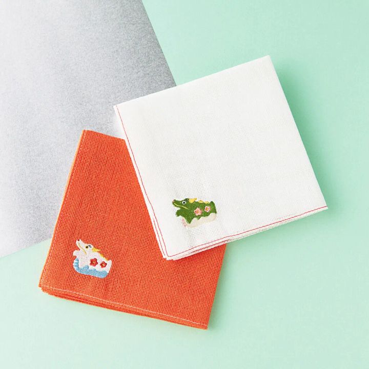 辰モチーフの刺繍が目を引く、正方形のふきん。目の粗い薄織物「かや織り」を4枚重ねで縫い合わせているので、丈夫で吸水性に優れ、使いこむほどに柔らかい風合いがでてきます。台拭きにはもちろんのこと、可愛い刺繍がアクセントになっているのでお手拭きにも◎。