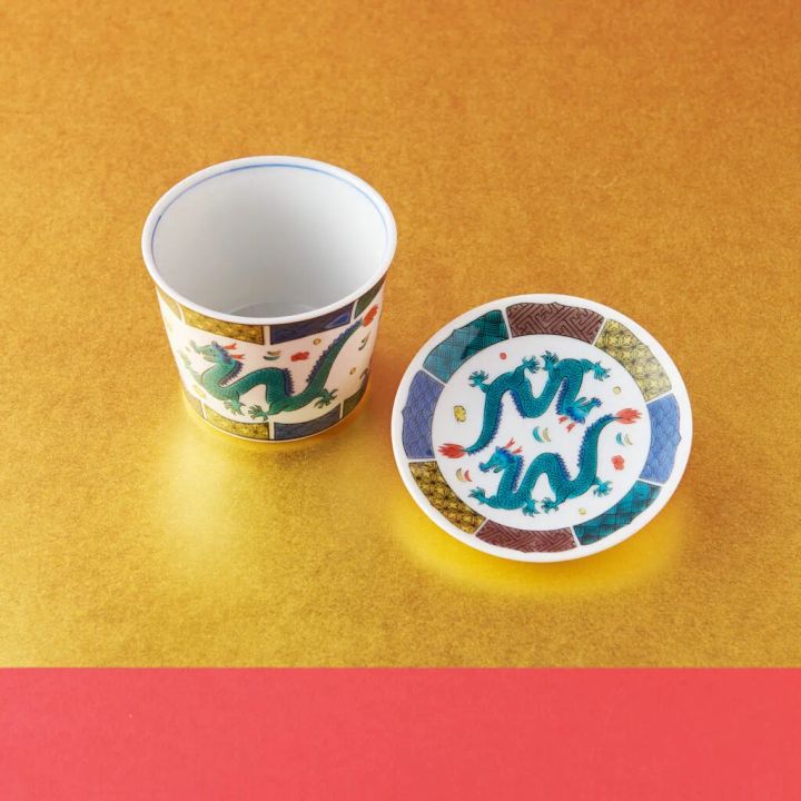 石川県南部の焼き物・九谷焼の窯元、青郊窯(セイコウガマ)の別注の豆皿と、そば猪口。九谷焼の特徴である鮮やかな彩りで描かれた辰と松竹梅、日の出の絵柄が目を引きます。祝いの席の食器として、インテリアの置物として様々な使い方ができそう。