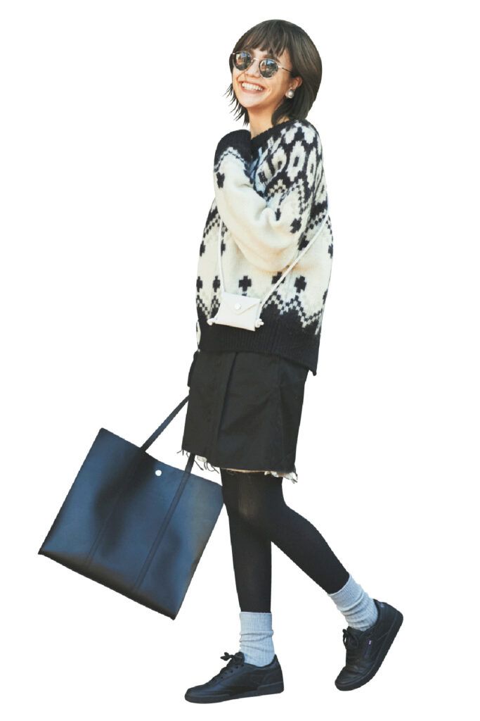 黒タイツ×黒スニーカーの間にグレーソックスを差し込めば、定番のモノトーンスタイルも新鮮に見違える。リブソックス¥3,080(ザ シンゾーン/シンゾーン ルミネ新宿店)スニーカー¥11,000(Reebok)ニット¥21,560(FRAY I.D/FRAY I.D ルミネ新宿2 店)ミニスカート¥31,900(ブリル/ブリル新宿)リブタイツ¥1,540(靴下屋/タビオ)ミニショル ダーバッグ¥11,000トートバッグ¥17,600(ともにジ アート オブ キャリング/TTIME)サングラス¥47,410(オリバーピープルズ/ルックスオティカジャパン カスタマーサービス)パールイヤリング¥12,960(アビステ)