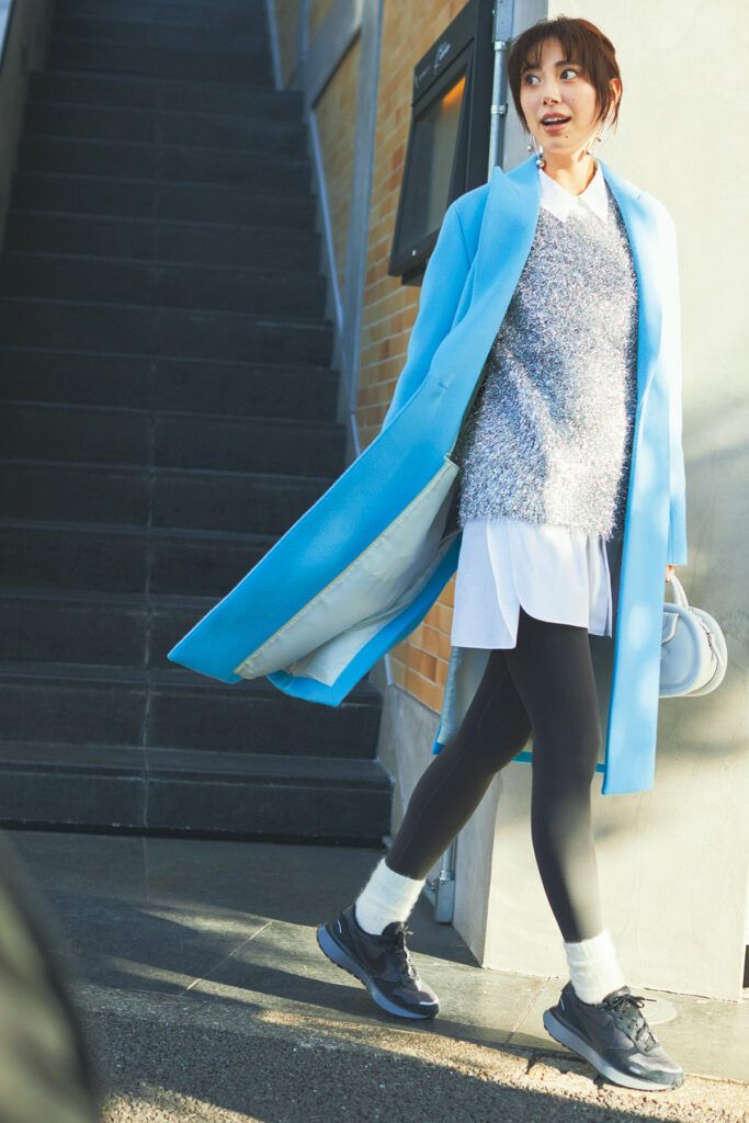 スポーティな黒レギンスも、起毛感が可愛いモヘアソックスと合わせればキレイめな印象に昇華。ラメニットの下から白シャツを覗かせて感度の高い休日スタイルに。モヘアソックス¥3,630(マルコモンド/ル タロン 有楽町マルイ店)スニーカー¥13,200(NIKE SPORTSWEAR/NIKE カスタマーサービス) コート¥92,400(ベイジ,/オンワード樫山 お客様相談室)ニット¥17,930(メゾンスペシャル/メゾンスペシャル 青山店)シャツ¥31,900(カオス/カオス丸の内)レギンス¥12,800 (lululemon)バッグ¥189,200(ピエール アルディ/ピエール アルディ 東京)ボールピアス¥19,980(アビステ)