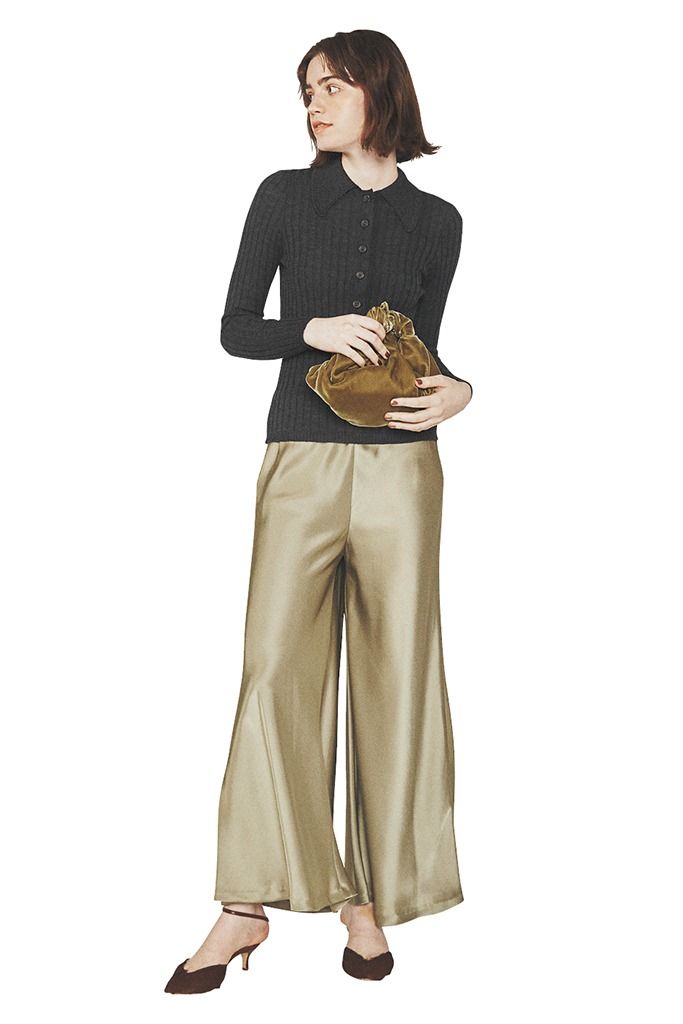 グレーリブニット 30,800円/ディアルテ(アダム エ ロペ) カーキサテンパンツ 35,200円/カオス(カオス丸の内) カーキバッグ 20,900円/パピルス(アイネックス) 茶ストラップミュール 68,200円/NEBULONI E.