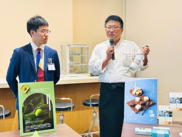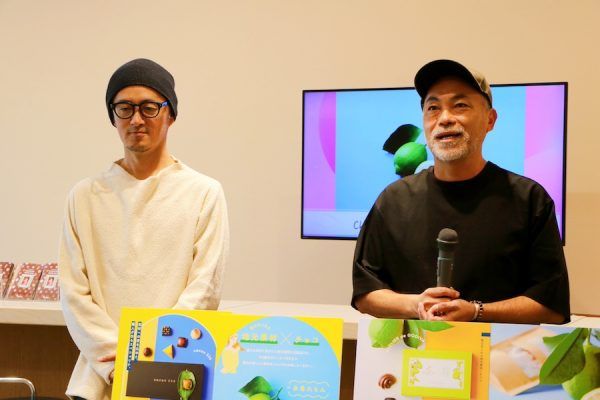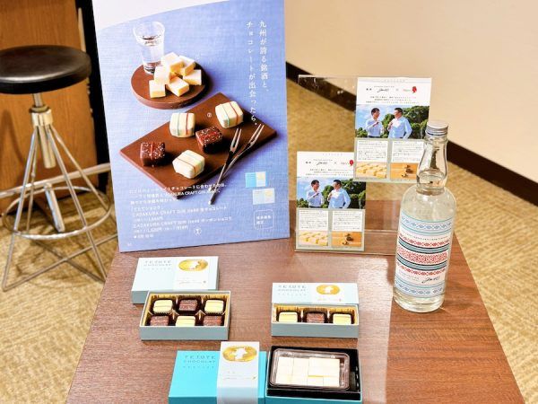 「すっきりとしたかんきつ系のジンなので、チョコレートと合わさったらどういうふうになるだろうと思っていたけど、ミルキーな感じで、おいしかったです。おたがいのいいところを引き立てあっている」と篠崎酒造の商品開発担当・栁祐太朗さん(左)。メリーチョコレートは全国の特産品を使った「てとてショコラ」を展開していて、「九州には魅力的な食材がたくさんあります。鰹節もチョコに合わせられそう」と株式会社メリーチョコレートカムパニーマーケティング本部研究開発部部長・大石茂之さん(右)