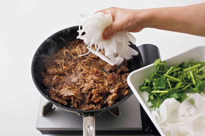 (2)フライパンにごま油大さじ1を中火で熱し、牛肉を入れてほぐしながら炒める。色が変わったら、にんにく、ねぎを加えてさっと炒め、酒大さじ1、砂糖小さじ1、しょうゆ大さじ2を順に加えてなじませる。大根、せりを加えてさっと炒め合わせ、一味唐辛子小さじ1/3~1/2をふって混ぜる。