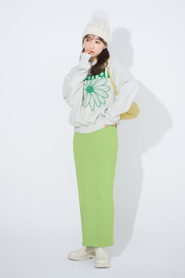ニットタイトスカート 12,650円/CREOLME(ROSE BUD ルミネエスト新宿店) グレーフラワースエット 11,000円/Mardi Mercredi(MARDI MERCREDI JAPAN) ショートブーツ 13,900円/チャールズ&キース(チャールズ&キース ジャパン) イエローバッグ 15,347円/STAND OIL(MUSINSA GLOBAL STORE) ニット帽 12,430円/CA4LA