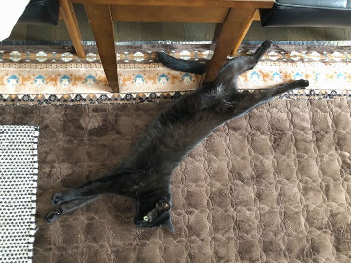 こーんなに伸びて寝るときもあるよ。お腹に秘密の白い毛があるの。内緒だよ。