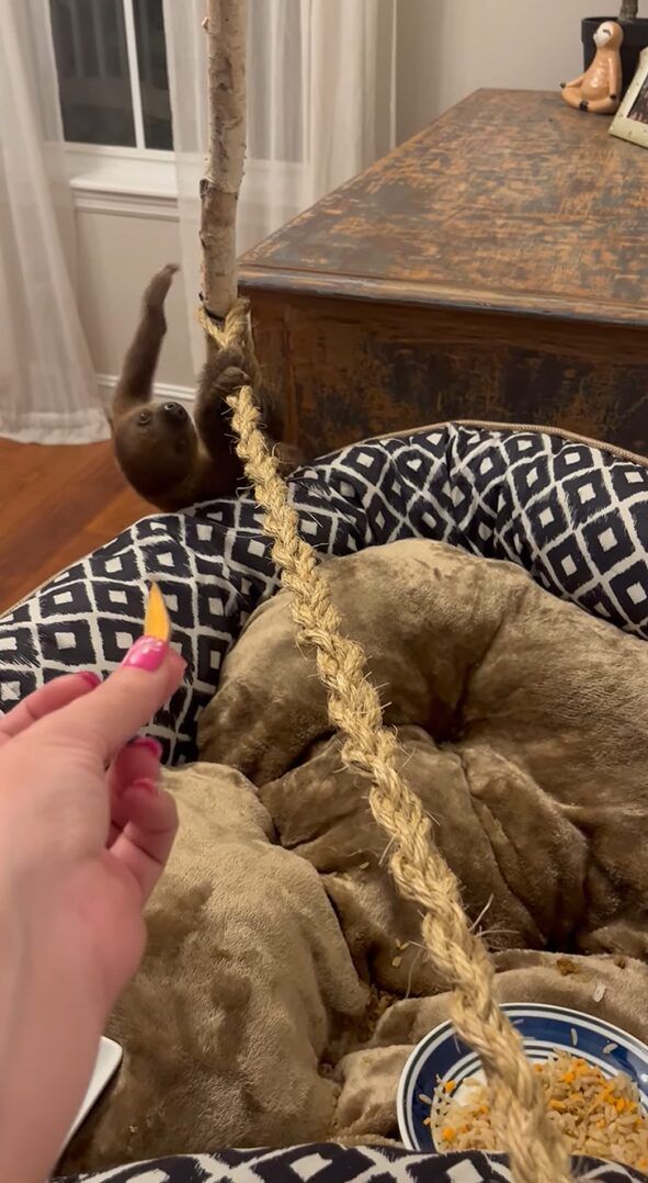 ロープによじのぼっているのは、生後4ヶ月だというフタユビナマケモノのの赤ちゃん『エリー』。 エリーを呼ぶ飼い主さんは、おやつとしておいもをあげるようです。
