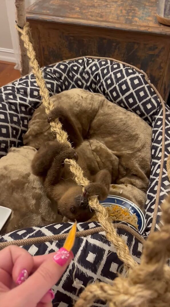おやつに向かって一直線とばかりにロープを進むナマケモノのエリー。 ところが、飼い主さんが持つおやつをスルーしました!