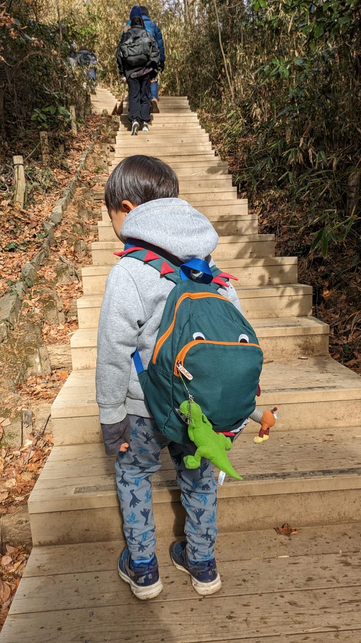9:45に登頂開始で、山頂には11:45に到着!ちょうど2時間で山頂に到着しました。最後に100段以上の階段がありましたが、みんな頑張りました。登り始めの時間を記録しておくと、楽しいかもしれません♪途中「隊長」という任務をお願いしてハイペースになったので、2時間半くらいを目安にすると良さそうです。