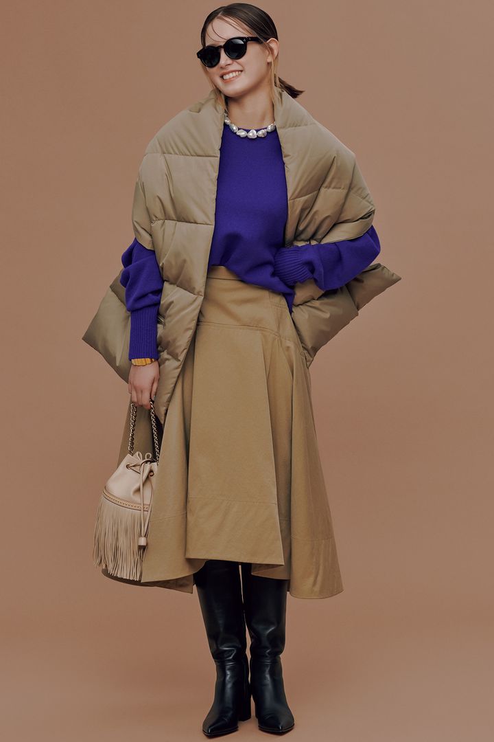 「ダウンショールでトレンド感をプラスしましたが、もちろんダウンベストでもこのバランスは作れます!」。ショール¥33,000(THIRD MAGAZINE)ニット¥37,400(チノ/モールド)スカート¥33,000(シーニュ)バッグ¥193,600(J&M デヴィッドソン/J&M デヴィッドソン カスタマーセンター)ブーツ¥286,000(ジャンヴィト ロッシ/ジャンヴィト ロッシ ジャパン)サングラス¥46,200(モスコット/モスコット トウキョウ)ネックレス¥96,800バングル¥134,200(ともにBijou de M)