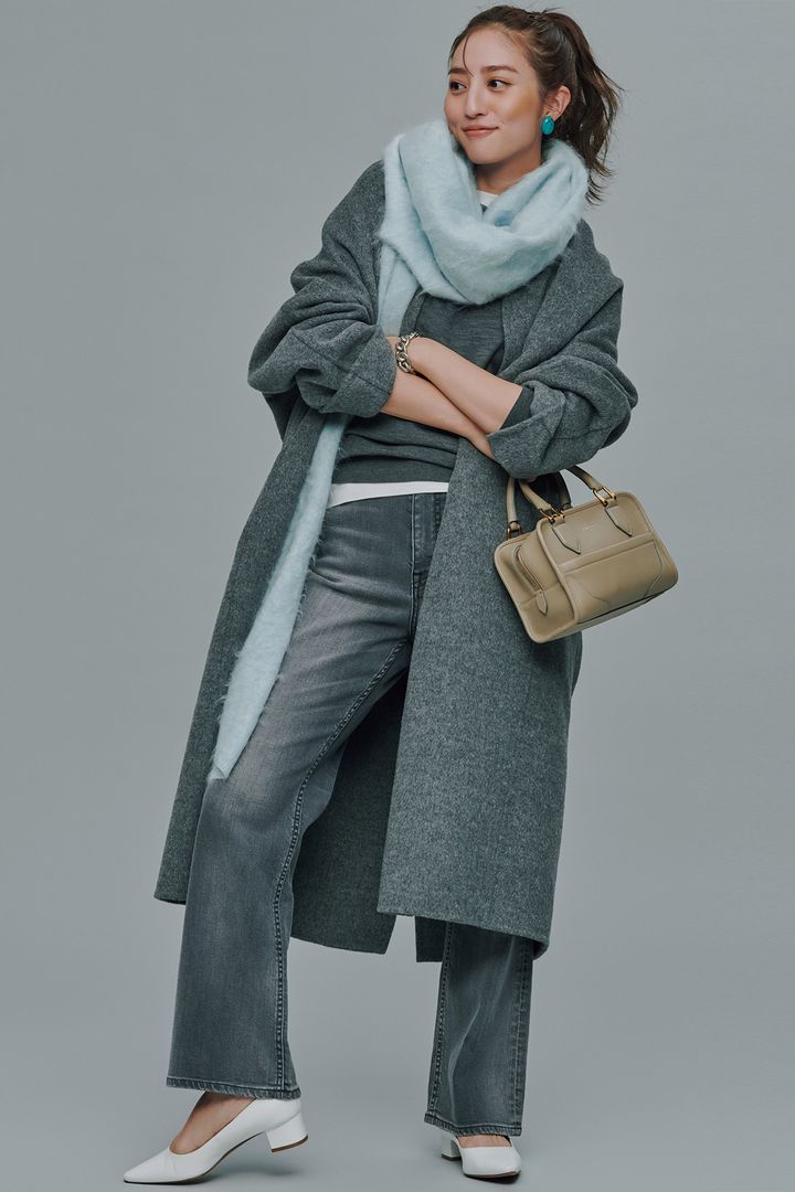 「グレーに効かせる差し色は、水色が今年の気分です」。コート¥115,500(ミニッツ/アパルトモン 神戸店)ニット¥39,600Tシャツ¥9,680(ともにスローン/ザ ショップ スローン 新静岡セノバ店)ストール¥68,200(アソース メレ/アイネックス)デニムパンツ¥16,500(ヘルシーデニム/ゲストリスト)バッグ¥198,000(J&M デヴィッドソン/J&M デヴィッドソン カスタマーセンター)パンプス¥64,900(ペリーコ/アマン)イヤリング¥12,600(アビステ)ブレスレット¥14,300(イン ムード/フォーティーン ショールーム)