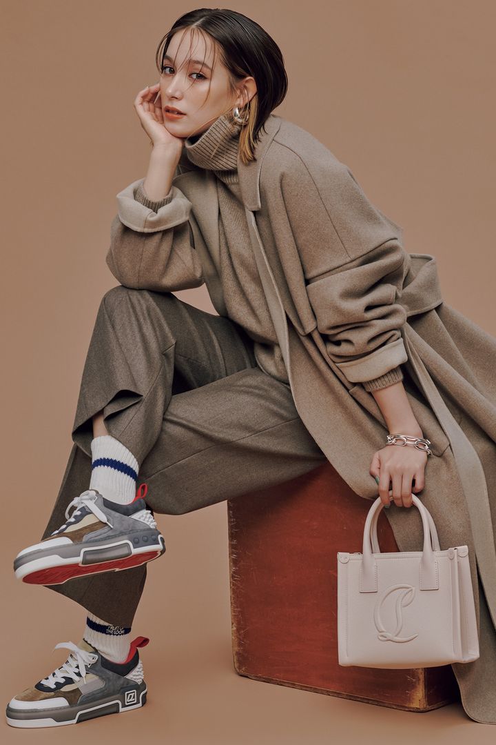 「グレーのニュアンスが感じられるベージュなら、着慣れていない人でもトライしやすいはず」。コート¥154,000パンツ¥49,500(ともにカオス/カオス丸の内)ニット¥88,000(スローン/ザ ショップ スローン 新静岡セノバ店)バッグ¥198,000スニーカー¥154,000(ともにクリスチャン ルブタン/クリスチャン ルブタン ジャパン)靴下[3P]¥1,760(フルーツオブザルーム/ギャレット)ピアス¥11,000ブレスレット¥12,100(ともにワンエーアールバイウノアエレ/ウノアエレ ジャパン)