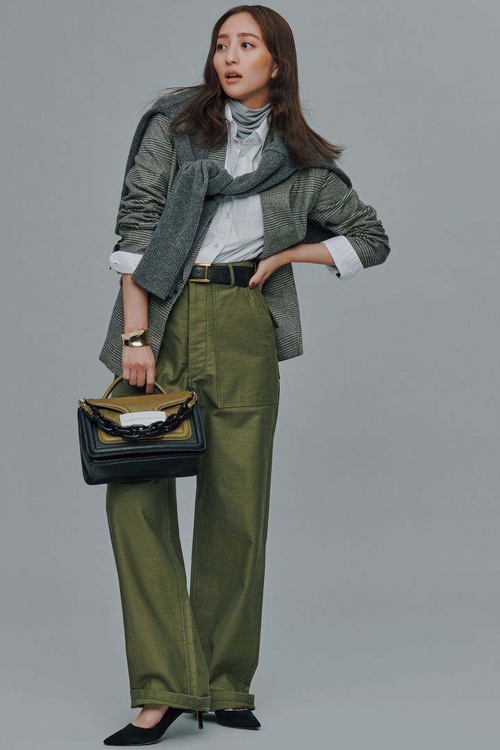 ジャケット¥49,500(アルアバイル)肩にかけたニット¥34,100(ザ シンゾーン/シンゾーン ルミネ有楽町店)シャツ¥12,000(バナナ・リパブリック)タートルカットソー¥16,500(THIRD MAGAZINE×ミコモリ/THIRD MAGAZINE)パンツ¥26,400(ハイク/ボウルズ)ベルト[参考価格]¥25,300〈アトリエ アンボワーズ〉パンプス¥64,900〈ペリーコ〉(ともにアマン)バッグ¥227,700(ピエール アルディ/ピエール アルディ 東京)バングル¥11,550(エイチアッシュ/フォーティーン ショールーム)