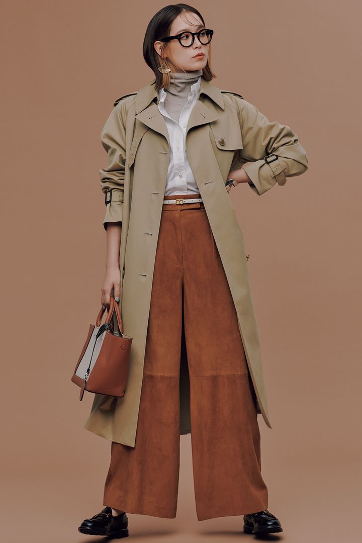 トレンチコート¥97,900(トラディショナル ウェザーウェア/トラディショナル ウェザーウェア ルミネ有楽町店)シャツ¥37,400(サクラ/インターリブ)ニット¥40,700(スローン/ザ ショップ スローン 新静岡セノバ店)パンツ¥85,000(バナナ・リパブリック)バッグ¥185,900ローファー¥116,600ベルト¥53,900(すべてトッズ/トッズ・ジャパン)メガネ¥42,900(モスコット/モスコット トウキョウ)ピアス¥16,500バングル¥52,800(ともにアダワットトゥアレグ)
