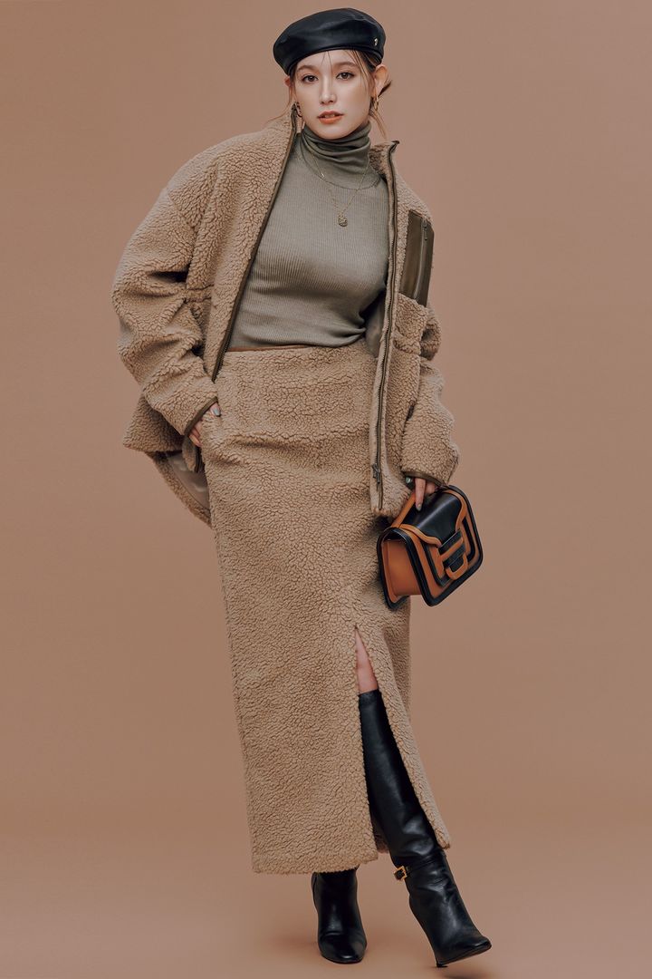 「カジュアルなボアのセットアップを、女っぽさを意識してスタイリング。スリットからブーツをのぞかせてカッコよく!ベージュは老けるなんて言わせません」。ボアジャケット¥63,800スカート¥39,600(ともにTHIRD MAGAZINE)ニット¥33,000(カオス/カオス丸の内)バッグ¥170,500(ピエール アルディ/ピエール アルディ 東京)ブーツ¥265,100(セルジオ ロッシ/セルジオ ロッシ カスタマーサービス)ベレー帽¥30,800(ヘレンカミンスキー/ヘレンカミンスキー ギンザシックス店)ピアス¥26,400ネックレス¥22,000(ともにマリハ)