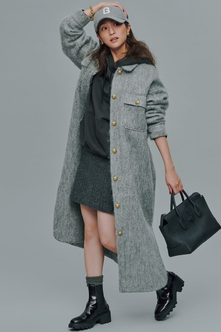 コート¥99,000(THIRD MAGAZINE)フーディ¥22,000(スローン/ザ ショップ スローン 新静岡セノバ店)スカート¥25, 300(ザ シンゾーン/シンゾーン ルミネ有楽町店)帽子¥12,100(グッドグリーフ/アパルトモン 神戸店)バッグ¥322,300ブー ツ¥119,900(ともにトッズ/トッズ・ジャパン)イヤリング¥12,600(アビステ)ブレスレット¥9,350(イン ムード/フォーテ ィーン ショールーム)靴下/スタイリスト私物