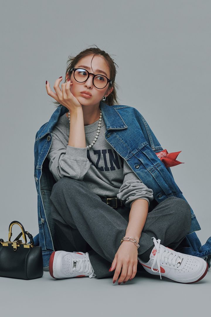 Gジャン¥50,600(ハイク/ボウルズ)ロンT¥17,600(THIRD MAGAZINE)パンツ¥23,100ポケットに入れたスカーフ¥7,150(ともにザ シンゾーン/シンゾーン ルミネ有楽町店)ベルト¥41,800(カルメイヤー/アパルトモン 神戸店)バッグ¥148,500(ザンケッティ/エリオポール代官山)スニーカー¥16,170(ナイキ スポーツウェア/NIKE カスタマーサービス)メガネ¥ 42,900(モスコット/モスコット トウキョウ)イヤリング¥5,250(アビステ)ネックレス¥12,100(ルル・ウィルビー/アルアバイル)ブレスレット¥11,000(イン ムード/フォーティーン ショールーム)靴下/スタイリスト私物