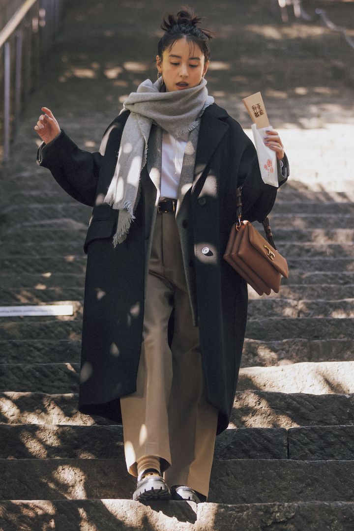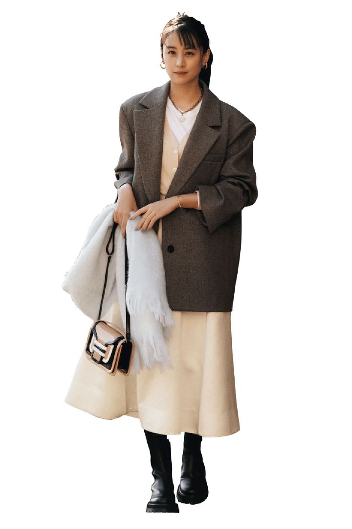 ドロップショルダーのざっくりデザインのコートなら、下にジャケットを忍ばせてもサマに。コート¥96,800(カオス/カオス丸の内)ジャケット¥46,200(FRAY I.D/FRAY I.D ルミネ新宿2店)カットソー¥18,700(サクラ/インターリブ)チノパン¥20,900(ザ シンゾーン/シンゾーン 表参道本店)バッグ¥355,300ローファー¥127,600(ともにトッズ/トッズ・ジャパン)ベルト¥15,400(アルアバイル)ソックス¥1,210(靴下屋/タビオ)ピアス¥4,320(アビステ)ネックレス¥17,600(ココシュニック オンキッチュ/ココシュニック)ストール¥38,500(アソース メ レ/マルティニーク ルミネ横浜)