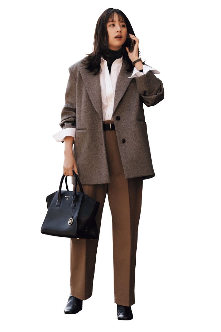 ジャケット¥46,200(FRAY I.D/FRAY I.D ルミネ新宿2店)シャツ¥26,400(マルティニーク/マルティニーク ルミネ横浜)タートルニット¥2,990(UNIQLO)チノパン¥20,900(ザ シンゾーン/シンゾーン表参道本店)バッグ¥63,800(マイケル マイケル・コース/マイケル・コース カスタマーサービス)ショートブーツ¥28,050(ダイアナ/ダイアナ 銀座本店)ベルト¥15,400(アルアバイル)時計¥14,850(クルース/HIROB ルミネ新宿店)