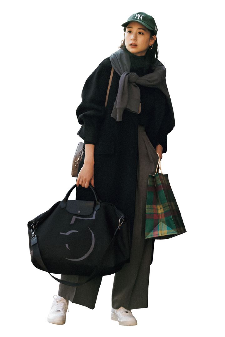 ブラック1色もかっこいいけれど、グレーを投入すると着こなしに奥行きが。コート¥96,800(カオス/カオス丸の内)タートルニット¥2,990(UNIQLO)スウェット¥13,200(カデュネ/カデュネ プレスルーム)パンツ¥23,980(ネイヴ)ショルダーバッグ¥37,400(ヴァジック/ヴァジックジャパン)トラベルバッグ¥46,200(ロンシャン/ロンシャン・ジャパン)スニーカー¥15,400(ナイキ/NIKE カスタマーサービス)キャップ¥4,400(ニューエラ)イヤリング¥8,640(アビステ)ネックレス¥29,700(アダワットトゥアレグ)