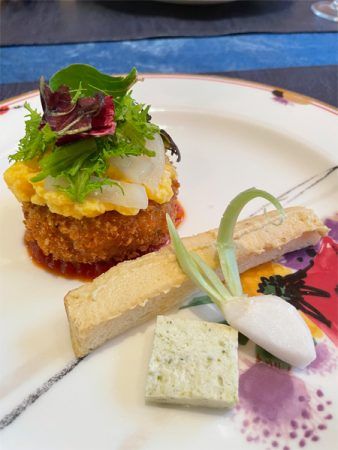 まずはオードブルの「ジャガイモのクロケットとスクランブルのサラダ仕立て」が運ばれてきました。熱々のクロケットとスクランブルエッグの相性が◯!見た目も鮮やかな野菜は、なんとシェフの井出勝徳さんが畑で育てているとのこと。新鮮で安心安全ですね!さらにカナッペに添えられているのは、ブロッコリー入りのクリームチーズとブルーチーズのムース。一つ一つに手が込んでいて感動!